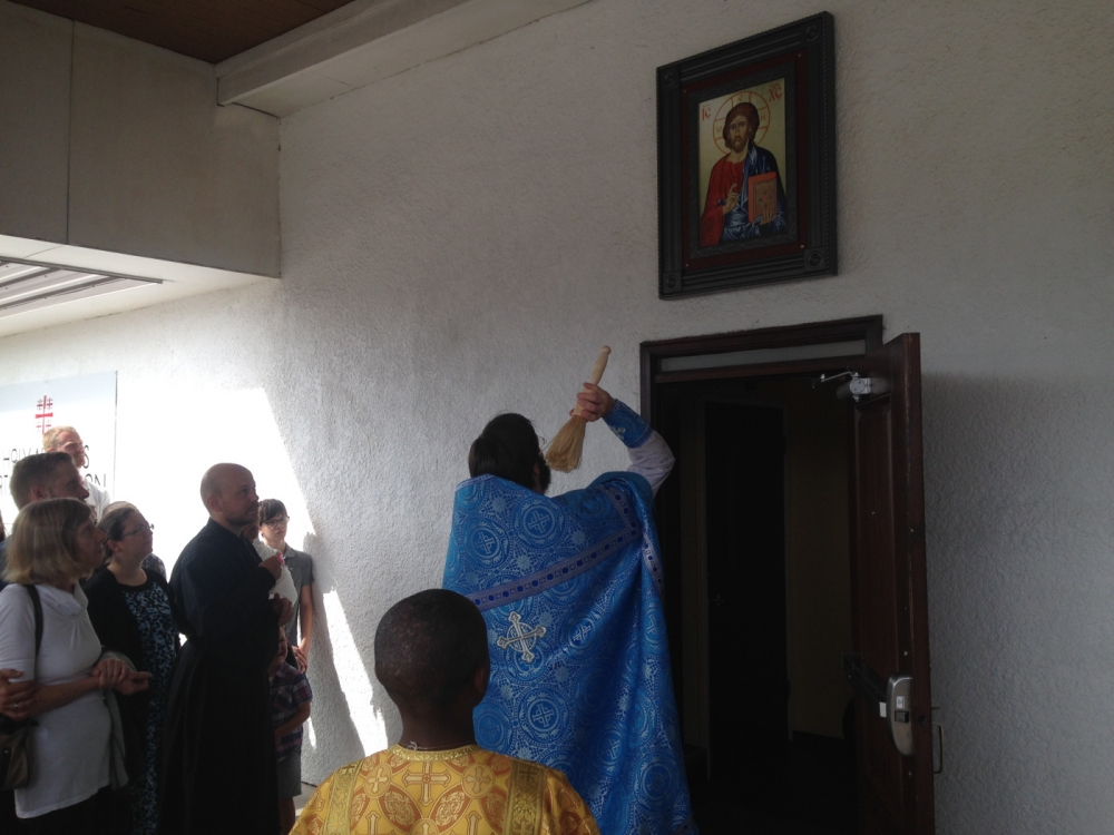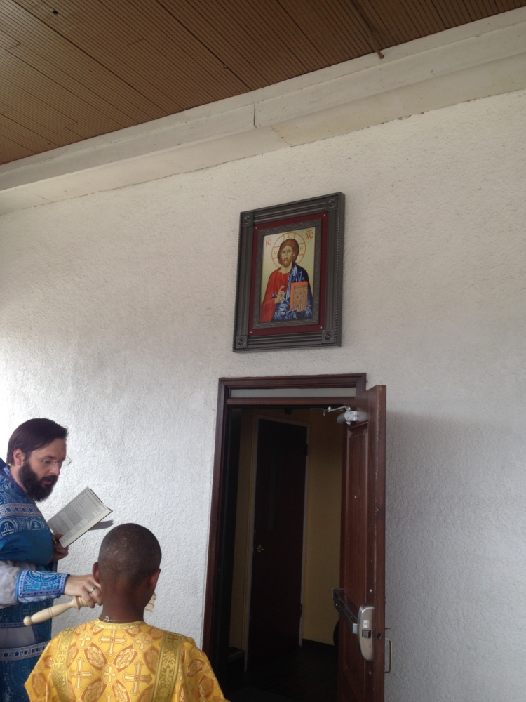Holy Apostles parishioner Kai Lerche, an experienced wood-worker, offered to make a traditional kiot, a frame to protect and display the icon. It was decided that we would mount the icon above the entrance door to Holy Apostles. Our landlords and neighbours at the St. Paul’s Lutheran Church gave their approval, and Kai proceeded with preparing the kiot. In early August of 2017, Kai, assisted by Subdeacon Barnabas Neufeld, mounted the icon in its place.