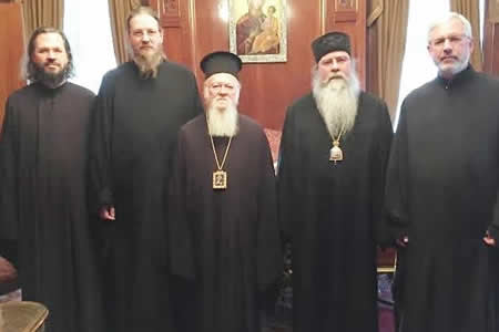 Ecumenical Patriarch Bartholomew with Metropolitan Tikhon and [from left] Frs. Alexander Rentel, John Behr and John Jillions at the Patriarchal Residence after visit to the Holy Theological School in Halki, December 2014.